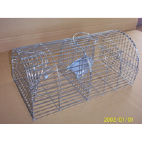 This live catch rat cage trap features a tapering tunnel entrance with a secondary holding cage.
